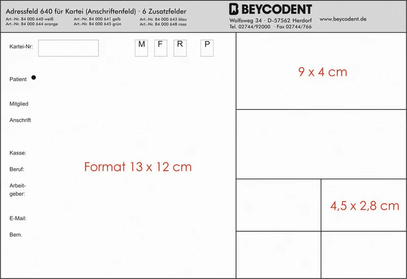 Optimaliser din praksisorganisering med Adressfeld 640 etikettene. Disse høykvalitets etikettene er spesialdesignet for A5/SL- og A4-Alpha-filer og gir med sitt romslige format på 13 x 16 cm tilstrekkelig plass til alle relevante pasientdata.