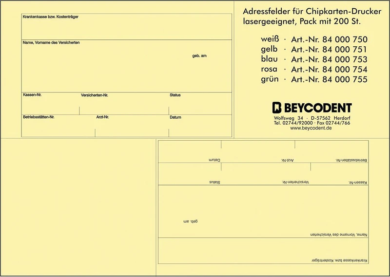 Optimaliser pasientadministrasjonen med adresseetikettene type 750. Disse høykvalitetsetikettene er spesielt utformet for chipkortutskrift og gir med sitt format på 8,2 x 5,5 cm tilstrekkelig plass til alle relevante pasientopplysninger.