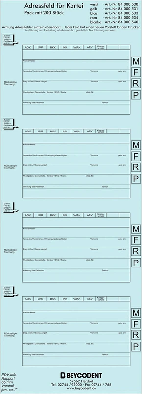 Disse adressefeltstrimler type 530 er spesielt konstruert for effektiv organisering av pasientjournaler i DIN A5/DL-format. Med fire under hverandre plasserte, enkeltavtagbare etiketter per stripe muliggjør de presis og ren merking. Takket være den nye fremskytningen for EDV-skrivere forblir baksideforskyvningen etter avtakelse av en etikett bevart, slik at skriveren alltid arbeider med samme avstand.