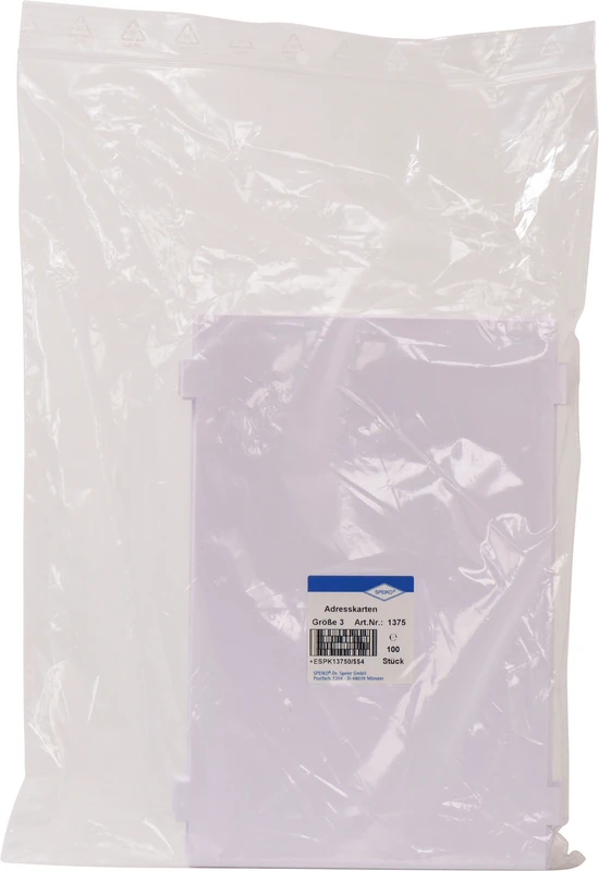 • Er laget av hvit kartong, kan skrives på begge sider og holdes av lukkeklemmene