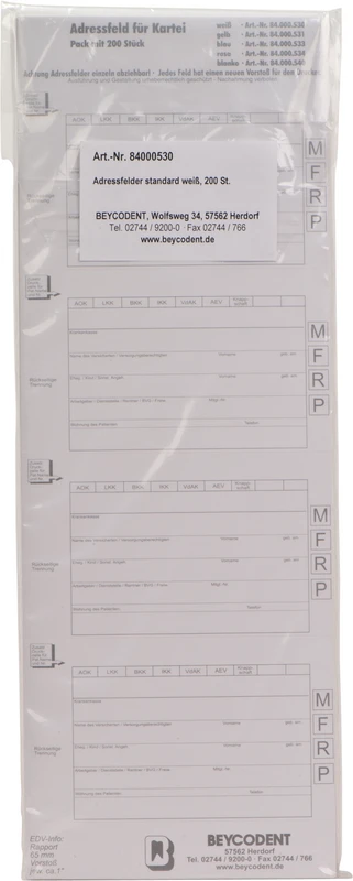 De Adressfeldstreifen Typ 530 er spesialdesignet for effektiv organisering av pasientjournaler i DIN A5/DL-format. Med fire under hverandre plasserte, enkelt avtakbare etiketter per stripe, muliggjør de presis og ren merking. Takket være det nye tiltaket for EDV-skrivere, forblir den bakre forskyvningen etter å ha fjernet en etikett, noe som gjør at skriveren alltid jobber med samme avstand.