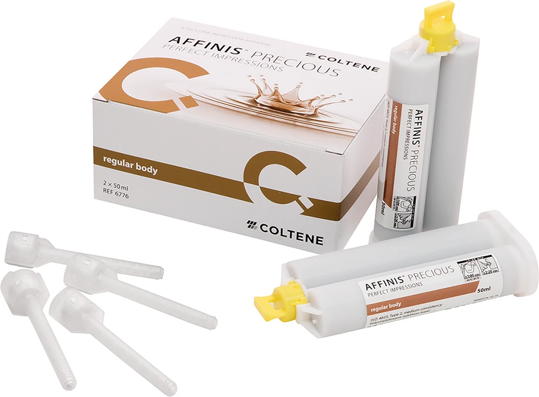 AFFINIS® PRECIOUS er den nyeste generasjonen av korrigeringsmaterialer. Flyteegenskapene er ytterligere optimalisert. Også den unike fargekombinasjonen – sølv og gull – forbedrer detaljeringen av avtrykket. AFFINIS® PRECIOUS korrigeringsmaterialer har en applikasjonstid på ett minutt. Gjennom den termo-reaktive formuleringen akselereres herdeprosessen så snart avtrykksskjeen plasseres i munnen.