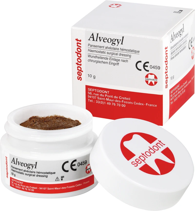 - Alveogyl påføres én gang, vaskes gradvis ut av seg selv uten lukking med en søm eller spesiell observasjon og etterkontroll i helingsfasen
