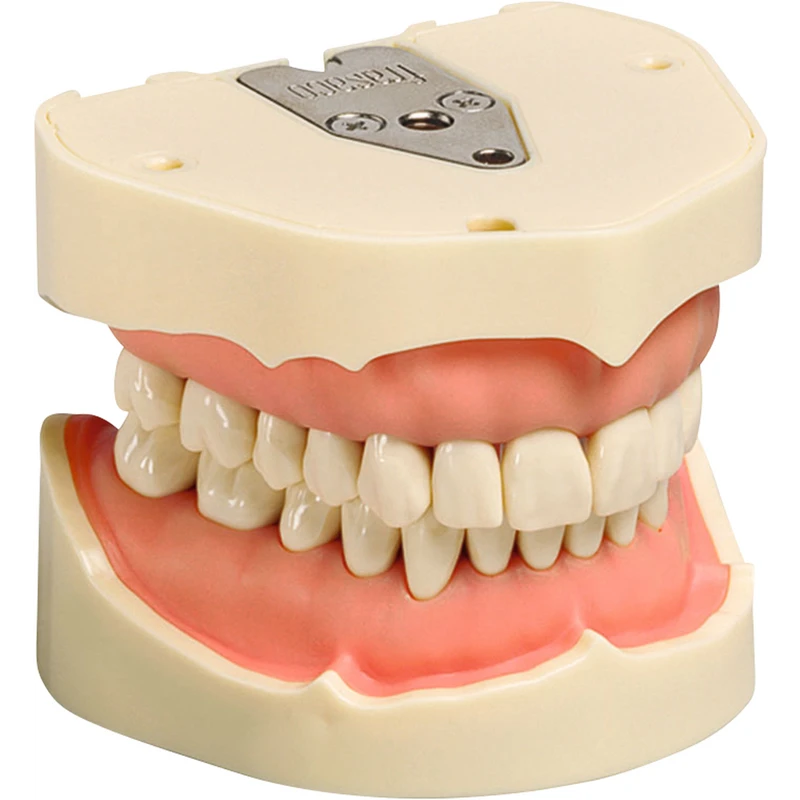Arbeidsmodell i henhold til et naturlig typisk voksent tannsett. Modellbasis laget av hard, formstabil plast. Over- og underkjeve okkluderer i en sikker sentrisk okklusjon med naturlige fysiologiske kontaktpunkter. 28 modelltenner av duroplast med kryssskruer i modellen stabilt festet og metallbakplate med gjenger for valgfrie skruing eller festing med magnetplater i frasaco-fantomhoder.
