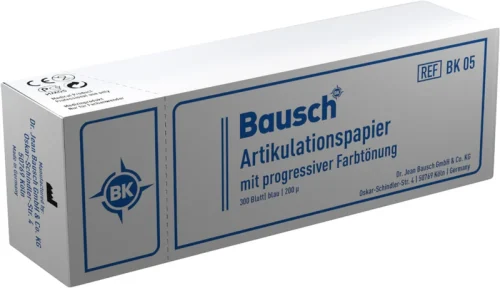 Bausch artikulasjonspapir med progressiv fargetoning 200 µ viser forskjellige bittkrefter gjennom kaudruckavhengig, fargeskjermet farging: Lett bitttrykk vises lyst – Sterkt trykk vises mørkt. Bare Bausch artikulasjonspapir med progressiv fargetoning 200 µ kan tydelig vise eksisterende kaudruckinterferenser. Etter justering eller lokalisering av feilkontakter bør det arbeides videre med tynnere testverktøy, som vi tilbyr opp til 8 µ tykkelse (Arti-Fol).