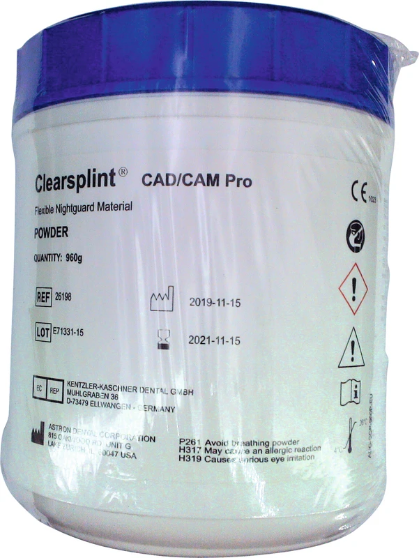 Premium material for bittskinner spesielt for digital produksjon av bittskinner i CAD/CAM-prosessen. De unike fordelene, som termoaktiv fleksibilitet, ekstrem holdbarhet og tilbakefjærende egenskaper med “Memory-effekt”, finnes også i denne varianten. CLEARsplint® CAD/CAM Pro må kun brukes på blanks fra Starter Kit eller på enhetsspesifikt egnede transparente blanks. Resultatet imponerer med presis passform og en overflate som bare trenger høyglanspolering.