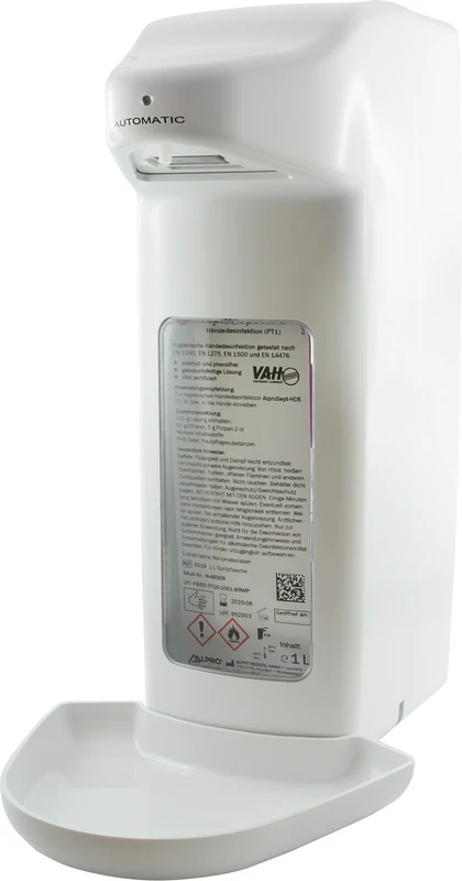 Automatisk veggdispenser for flytende såpe og alkoholholdige hånddesinfeksjonsløsninger, inkl. dryppbrett. Egnet for 1 L og 500 ml Euroflasker.