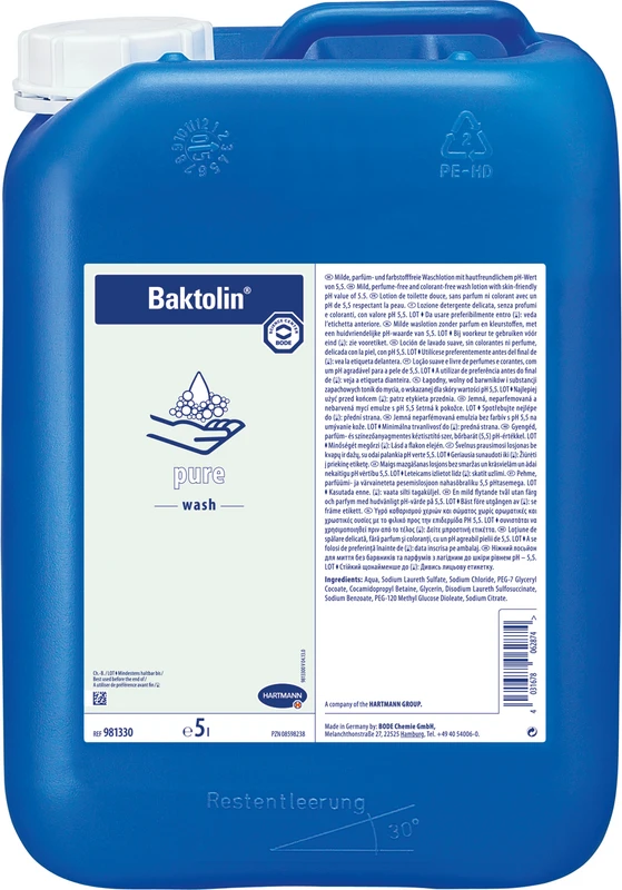 Baktolin® pure kommer spesielt sensitive brukere til gode ved å unngå dufter og fargestoffer. pH-verdien på 5,5 skåner den naturlige syrebeskyttelsen til huden. Samtidig gjør dette produktet det også spesielt egnet for bruk i næringsmiddelbehandlende områder, der en påvirkning av de behandlede varene skal unngås.