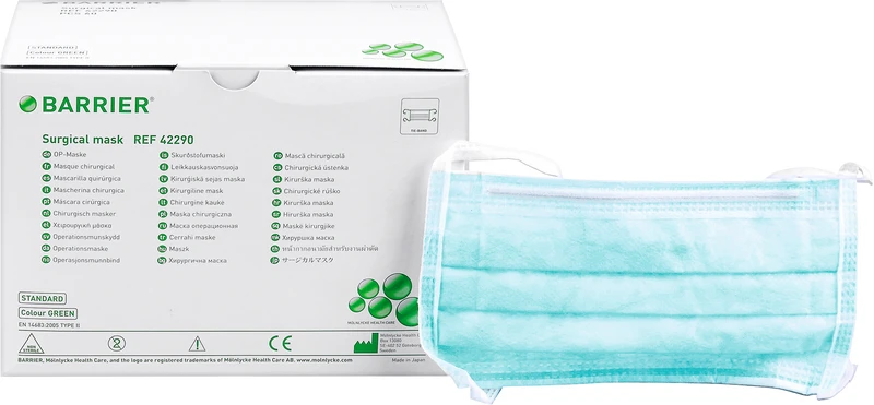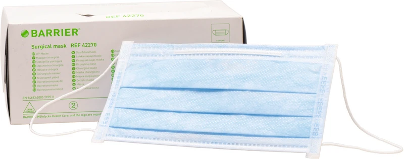 OP-maske med en bakteriell filtreringseffektivitet på = 98 %. Valgfritt med bånd eller ørelooper. Den spesielt stabile nesebøylen forhindrer at pusten strømmer ut ved maskekantene og sørger for luftstrømmen gjennom filteret.