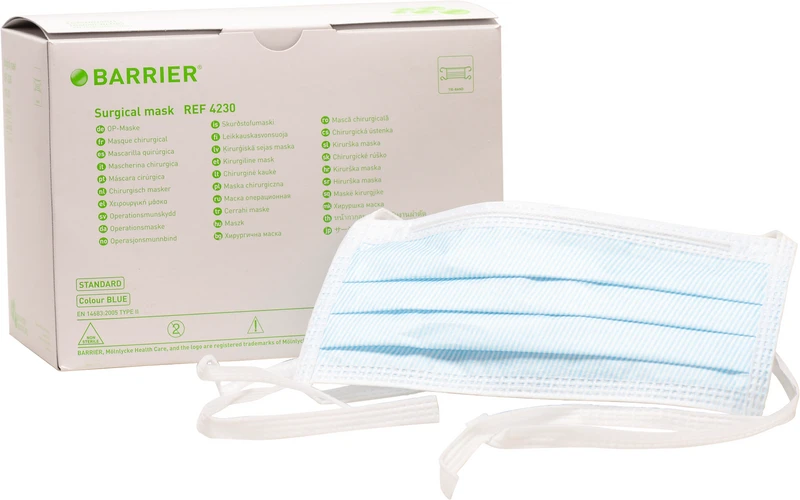 OP-maske med en bakteriell filtreringseffektivitet på = 98%. Valgfritt med bindebånd eller øresløyfer tilgjengelig. Den spesielt stabile nesebøylen forhindrer at pusten strømmer ut ved maskens kanter og sørger for luftstrøm gjennom filteret.