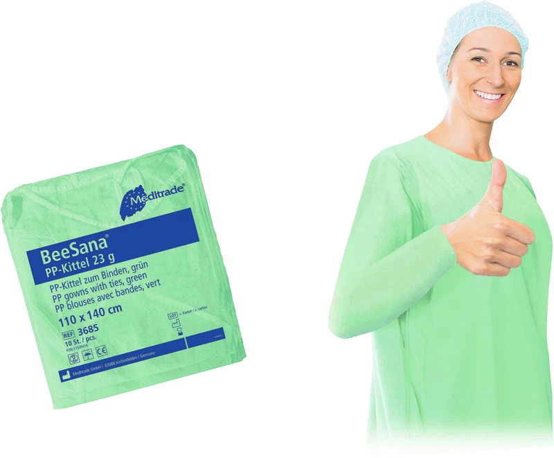 Beskyttelseskittel laget av PP-fleece med tykkelse 23 g/m². Lukkebånd ved hals og midje. Ermeavslutning valgfritt med innsydd, elastisk gummibånd eller strikk. Lett, pustende materiale, rivesterk og samtidig fuktavvisende, ikke-steril, for engangsbruk.