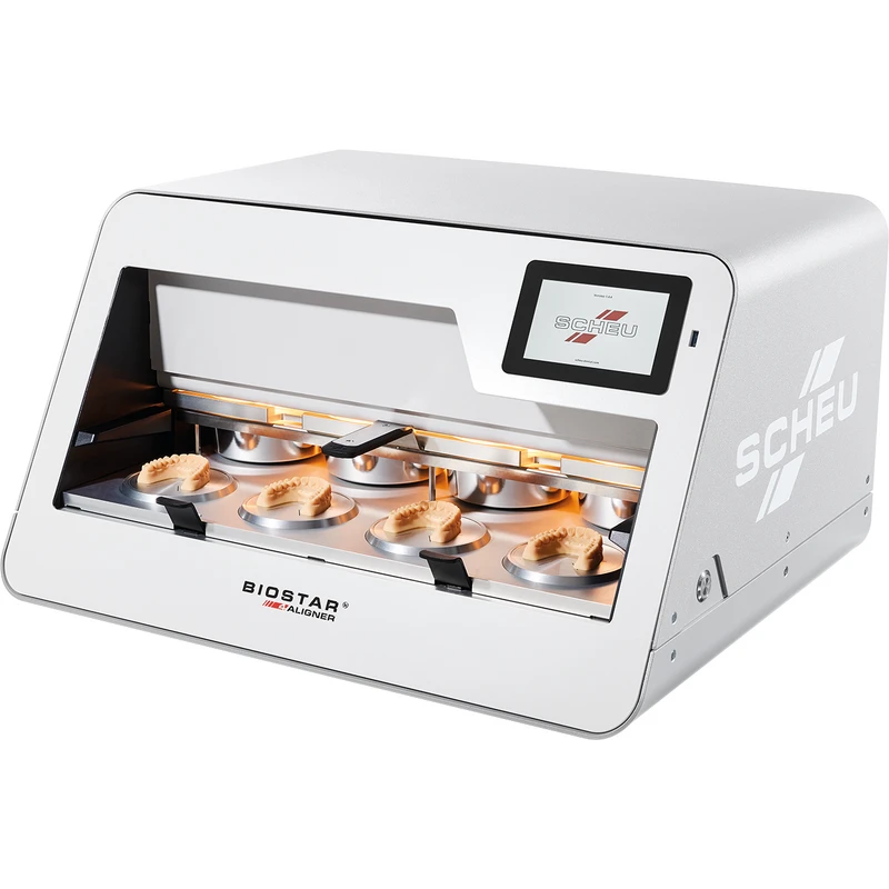 Der BIOSTAR® 4-Aligner er et avansert flerposisjons termoformingsapparat. Med sin innovative teknologi kan opptil 4 alignere formes samtidig, noe som gir en imponerende produksjonskapasitet på opptil 120 alignere per time. Hver aligner formes i sitt eget trykkammer ved 4 bar. BIOSTAR® 4-Aligner tilbyr fleksibilitet ved å kunne bruke forskjellige SCHEU-DENTAL folieformater. Dette inkluderer runde folier med en diameter på 120–125 mm samt rektangulære Stripes (499 x 114 mm), eksklusivt tilgjengelig hos SCHEU-DENTAL, som muliggjør firedelt bruk. Takket være den unike termisk regulerte infrarøde stråleren når enheten optimal arbeidstemperatur i løpet av noen sekunder. Alle relevante parametere som oppvarmings- og avkjølingstider kan hentes ved hjelp av en skanner eller ved kodeinndata. Det fargede displayet leder brukeren oversiktlig gjennom de enkelte arbeidstrinnene i termoformingsprosessen. Grensesnittet på BIOSTAR® 4-Aligner muliggjør enkle programvareoppdateringer for å sikre at enheten alltid er oppdatert med siste teknologi.
