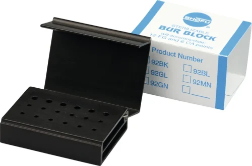 Den praktiske snap-låsen til Bur Block beskytter den oppnådde sorteringen av instrumentene; de åpne sidene muliggjør full desinfisering og sterilisering av opptil 18 instrumenter (12x FG og 6x RA). Avhengig av arbeidsfeltet (kavitetspreparasjoner osv.) kan man lage et eget fargekodet instrumentsett.