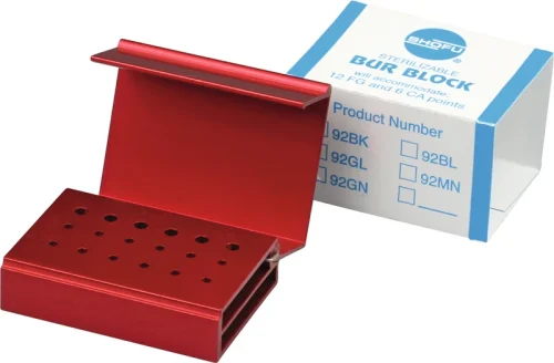 Den praktiske snap-låsen til Bur Block beskytter den oppnådde sorteringen av instrumentene; de åpne sidene muliggjør full desinfisering og sterilisering av opptil 18 instrumenter (12x FG og 6x RA). Avhengig av arbeidsfeltet (kavitetspreparasjoner osv.) kan det opprettes et eget fargekodet instrumentsett.