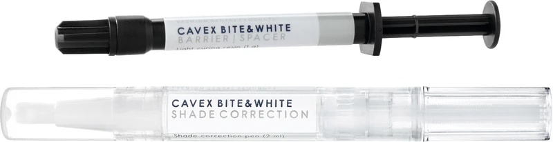 Cavex Bite&White Shade Correction er et raskt, sikkert og effektivt system for å gjenopprette pasientens naturlige tannfarge. Det er et in-office-system for medisinsk bleking. Hele inngrepet utføres av tannlegen i tannlegepraksisen. Det revolusjonerende gelen i systemet muliggjør gjenoppretting av den opprinnelige tannfargen på bare 2-3 applikasjoner i løpet av en økt. På grunn av den unike formelen virker gelen veldig raskt. Dette minimerer behandlingstiden og dermed risikoen for overfølsomhet. De termoreversible egenskapene til gelen sørger for at den forblir perfekt på plass under behandlingen, noe som maksimerer sluttresultatet. Systemet består av en unik applikatorstift med en børste for maksimal kontroll under påføring og en beskyttelsesbarriere for å beskytte det omkringliggende myke vevet.