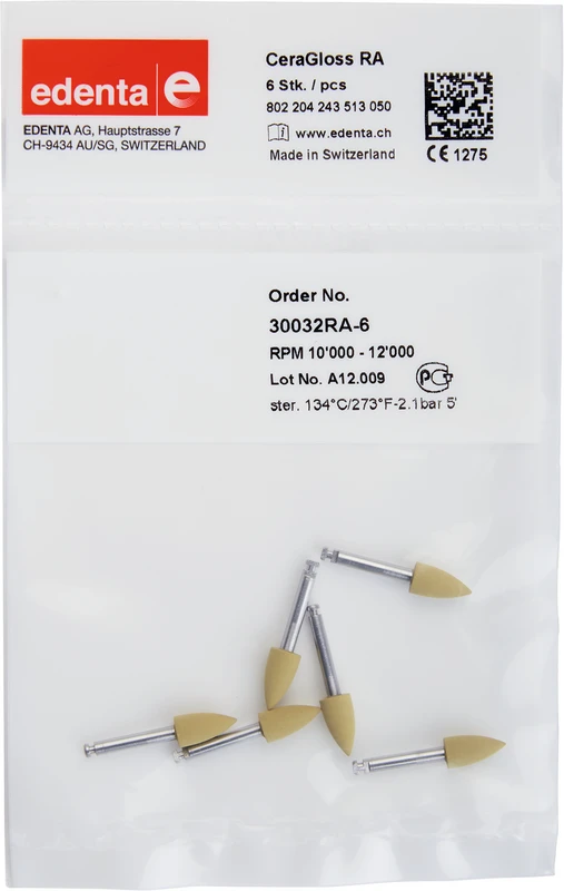 3 – trinn diamant – poleringssystem for alle keramiske fyllinger, del- og helkroner – restaureringer. Polerer med naturdiamantkorn for finishing, polering og høyglans – polering av keramiske – overflater. En ny glansbrenning etter utført korreksjon er unødvendig.