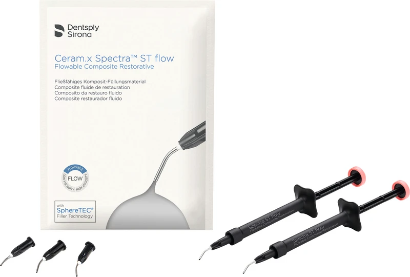 Ceram.x Spectra™ ST flow er det ideelle tillegget til universalkompositt Ceram.x Spectra™ ST og er også basert på SphereTEC® fyllstoffteknologi. Det er spesielt utviklet for å optimalisere de viktigste områdene for behandleren: håndtering, estetikk og holdbarhet. Ceram.x Spectra™ ST flow er tilgjengelig i totalt 5 farger, både i Compula® Tips og i sprøyter.