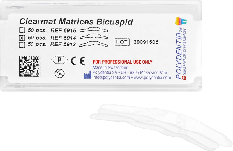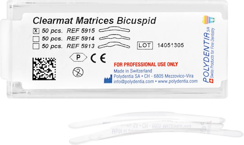 De ferdigformede, transparente polyestermatrisene gjør fullstendig herding mulig for alle MOD-komposittfyllinger i approksimale kasseområder ved premolarer og molarer. Lysgjennomtrengelige. God tilpasning og gode kontaktpunkter.