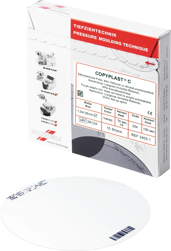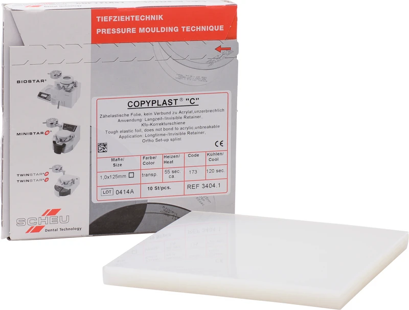 Høytransparente, seigelastiske, ubrytbare, abrasjonsbestandige folier, fester seg ikke til autopolymerisat. Langtids- og usynlige retainere, ortodontiske korrigeringsskinner.