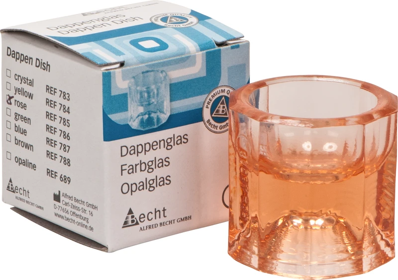 Av farget glass, ti-kantet, gripevennlig, ulikt formet på begge sider. Egnet for blanding av sementer og plastmaterialer. Ø 32 mm, 30 mm høy, ca. 2-3 ml volum. Ikke autoklaverbar.