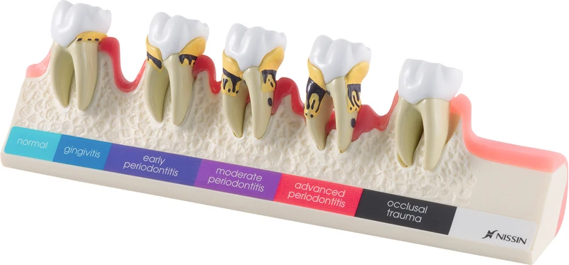 Modell med tverrsnittsmessig fremstilling av parodontale defekter i fire stadier, med tannstein og plakk. Visning på baksiden med rødlig betent tannkjøtt. Visning av traumatiske tyggeflate- og tannfestedefekter ved en ekstra molar kan føre til en akselerert parodontose.