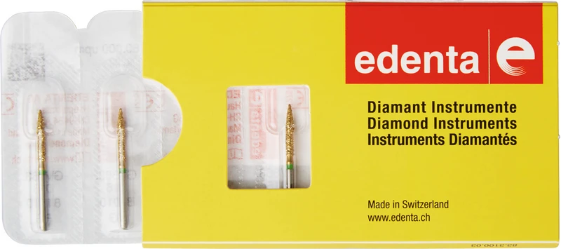 MultiLayer diamantinstrumenter med spesiell belegg. Høyeste holdbarhet for naturdiamantene og derfor meget lang instrumentlevetid. Selvrensende effekt ved hurtig fjerning av slipeavfall. Kjølig sliping. Glatt slipebilde. Atraumatisk og raskere prepering.