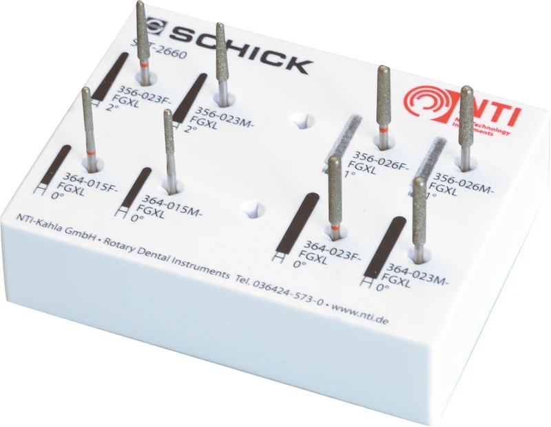 Diamant verktøysett med FG-skaft for bearbeiding av gjennomsintrert zirkon med turbinen. 0°, 1° og 2° diamanter hver i grov og fin for forsliping og finpussing.