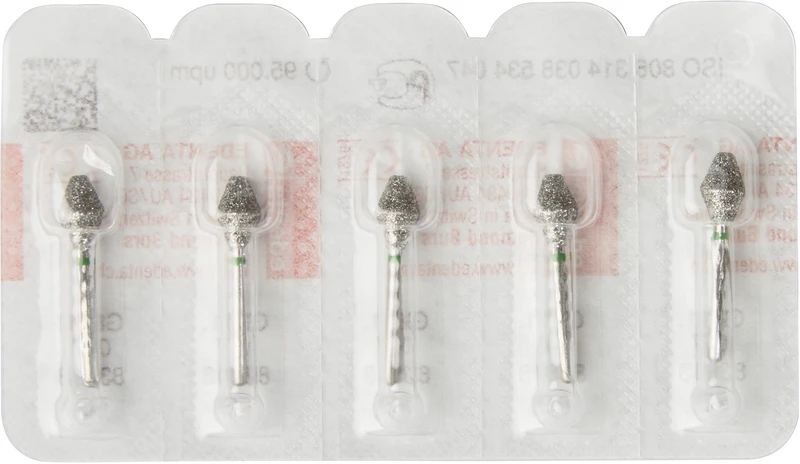 MEISINGER diamantinstrumenter består i kjernen av et skaft og en herdet, rustfri profilkropp, som ved hjelp av moderne galvanoteknologi kun belegges med utvalgte naturlige diamantkorn. Dette garanterer en svært homogen, sikker og varig diamantisering av instrumentene og dermed optimale arbeidsresultater. Dette sikres også ved at brukeren kan velge mellom opptil syv forskjellige kornstørrelser.