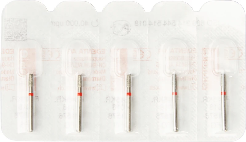 | Variant | <b>pakke</b> 5 diamantbor røde fine, FG, figur 544 konus kant rund, hodelengde: 4 mm, ISO 018 |