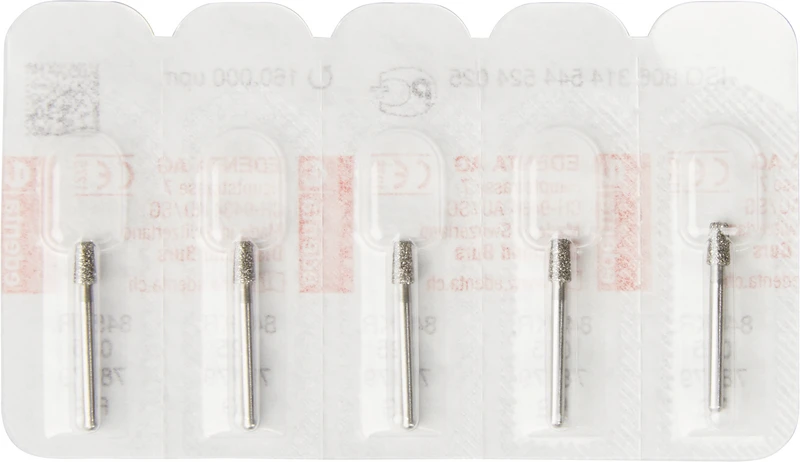 | Variant | <b>Pakke</b> 5 diamanter standard, FG, figur 544 konus kant rund, hodelengde: 4 mm, ISO 025 |