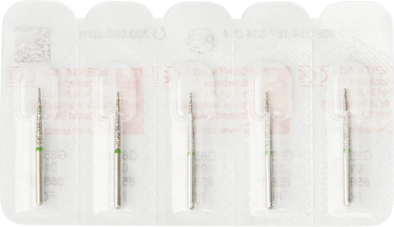 | Variant | Pakke 5 diamanter grønn grov, FG, figur 167 konus lang spiss, hodelengde: 11,5 mm, ISO 014 |