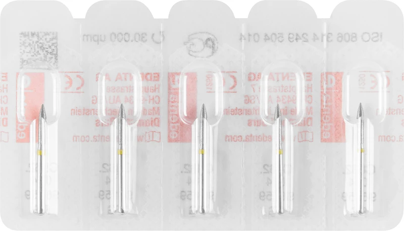 | Variant | Pakke 5 diamanter gul superfin, FG, figur 249 flamme, hodelengde: 8 mm, ISO 014 |