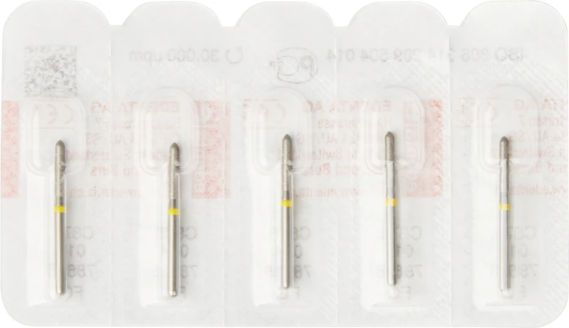 | Variant | <b>Pakke</b> 5 diamanter standard, FG, figur 289 torpedo sylindrisk, hodelengde: 8 mm, ISO 009 |