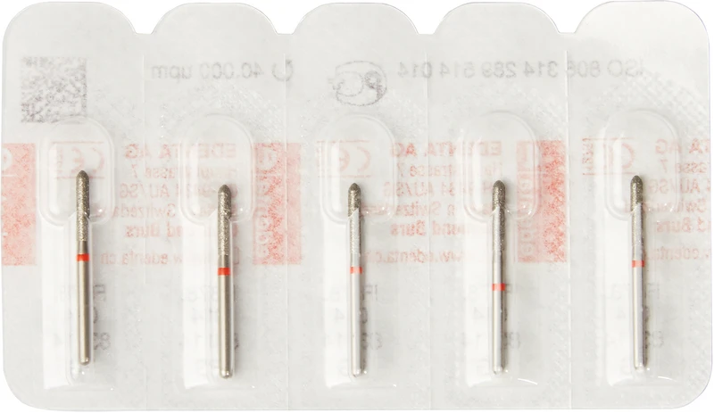 | Variant | Pakke 5 diamanter røde fine, FG, figur 289 torpedo sylindrisk, hodelengde: 8 mm, ISO 014 |