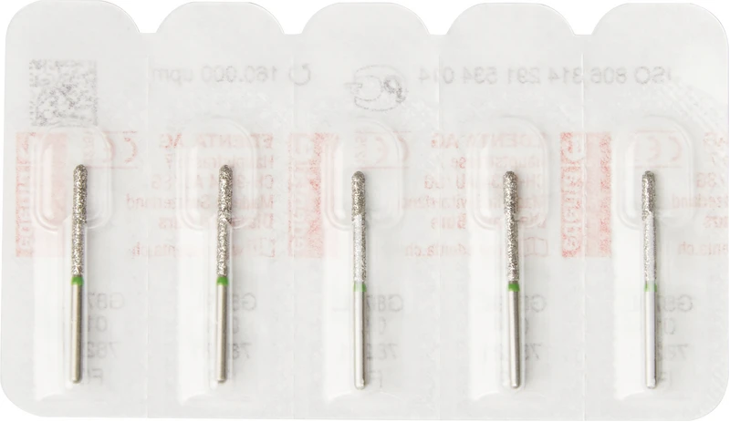 | Variant | Pakke 5 diamanter grønn grov, FG, Figur 291 torpedo lang, hodelengde: 12 mm, ISO 014 |