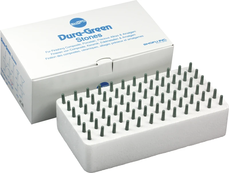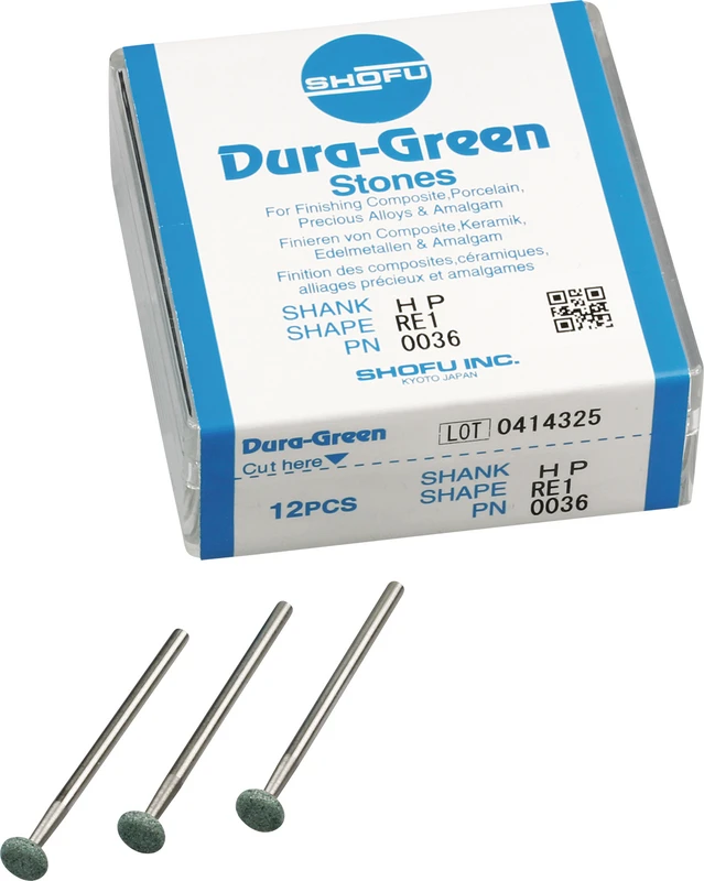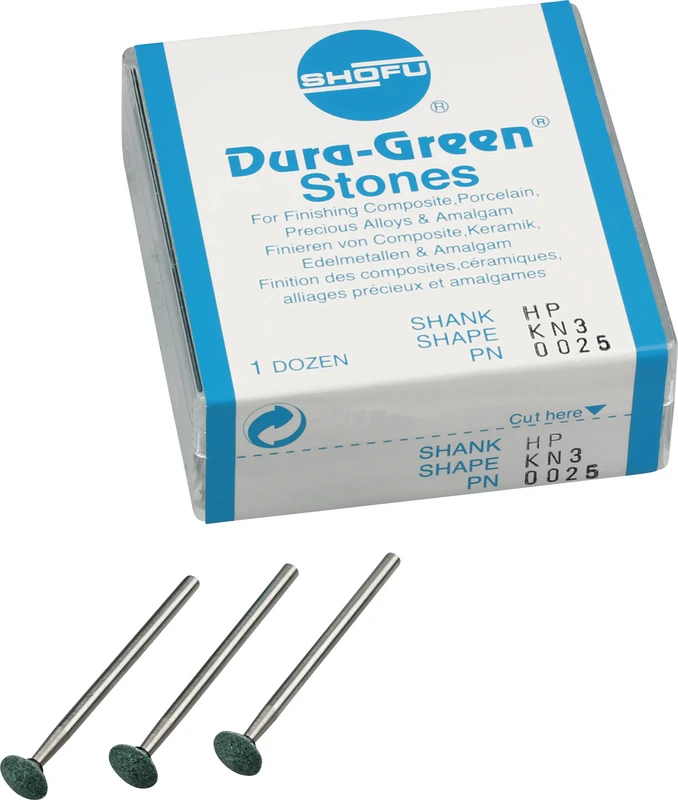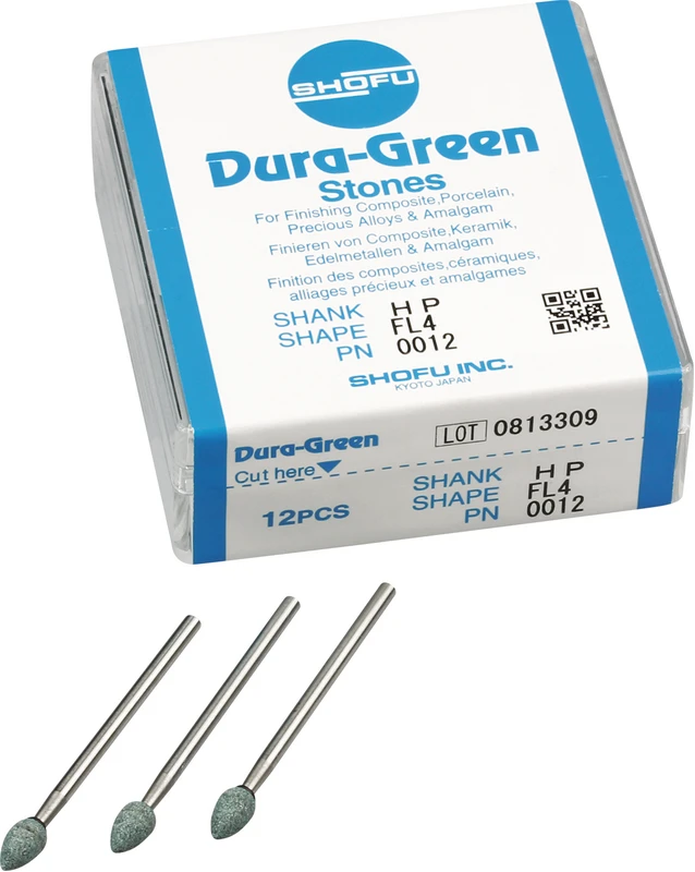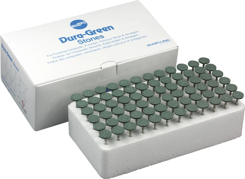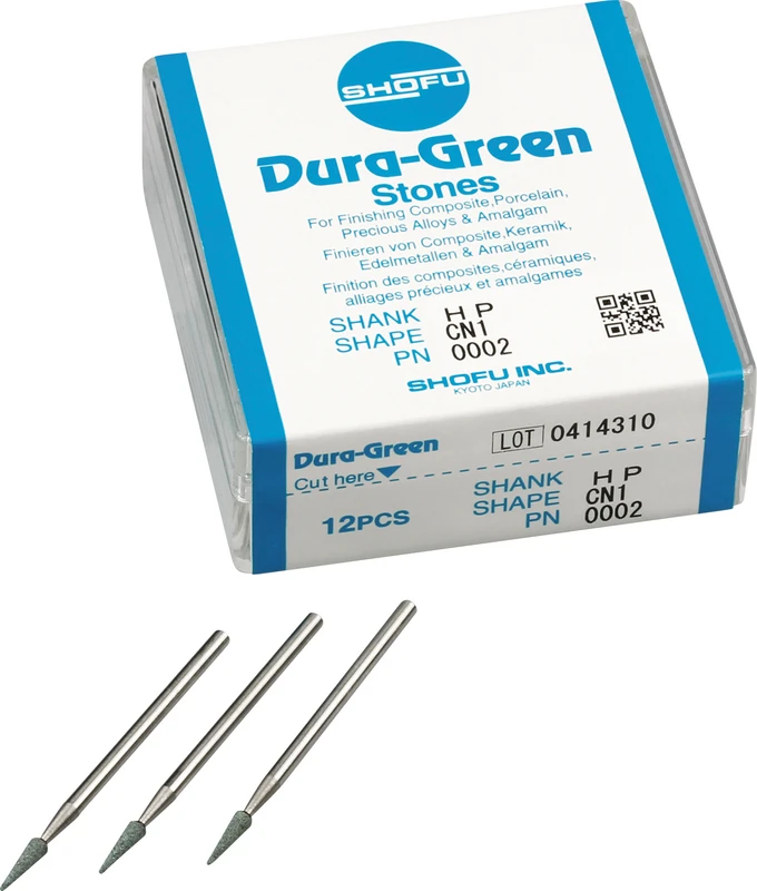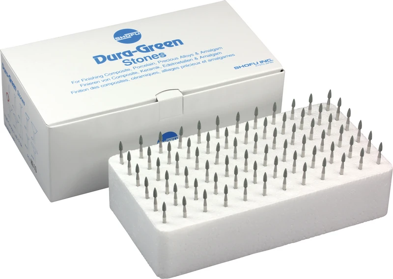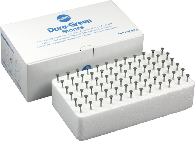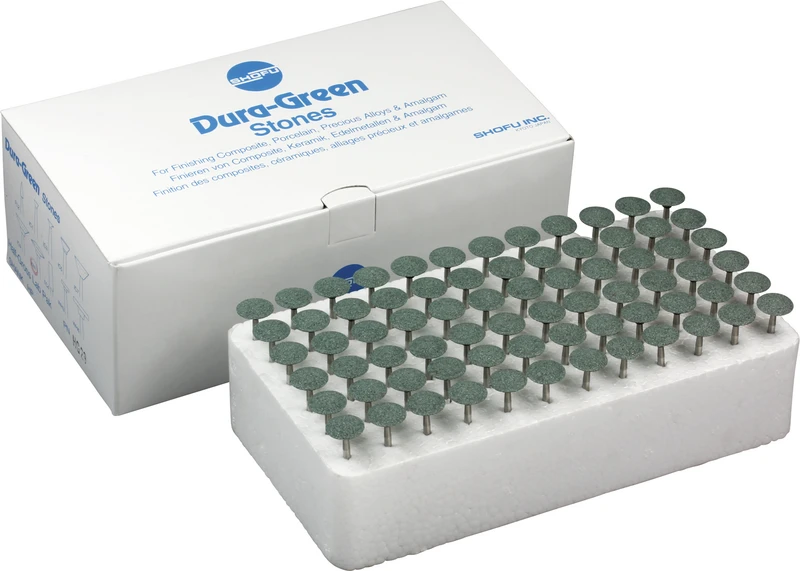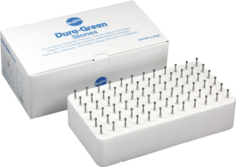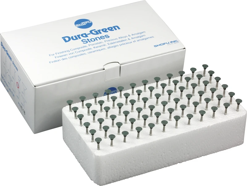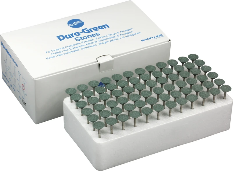 Dura-Green-Steine eignen sich hervorragend zum splitterfreien Ausarbeiten von Keramik, Komposit, Edelmetall und Amalgam. Empfohlene Drehzahl 5.000 – 20.000 U/min., max. Drehzahl 30.000 U/min. / AD 3 – 5 N.