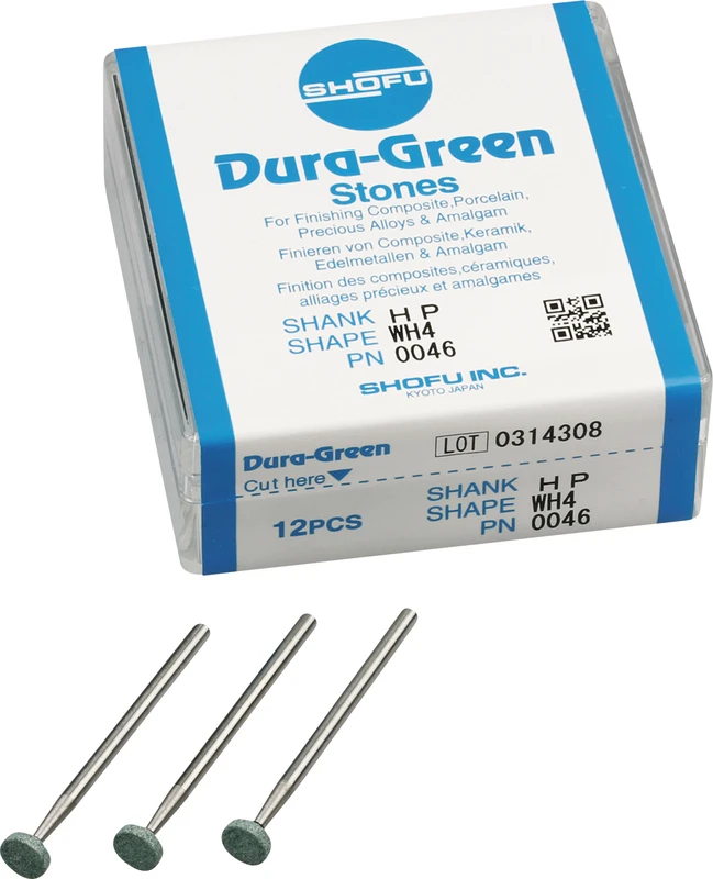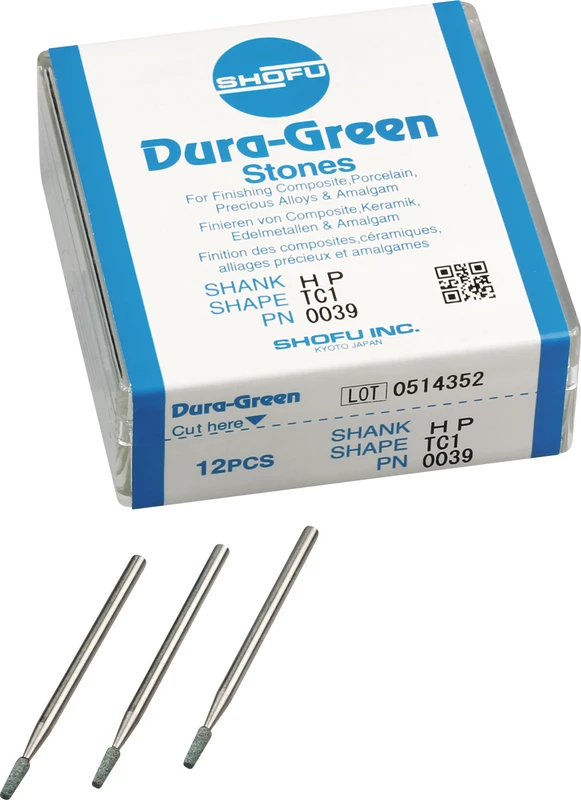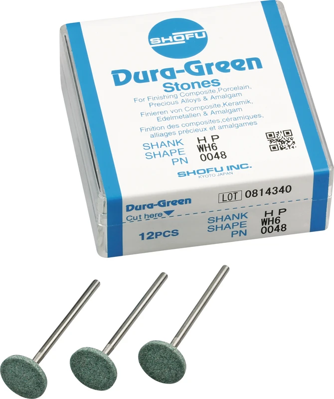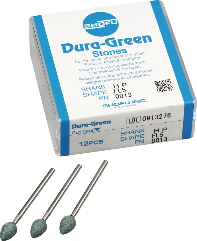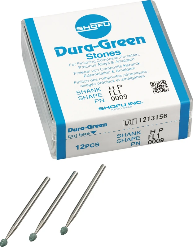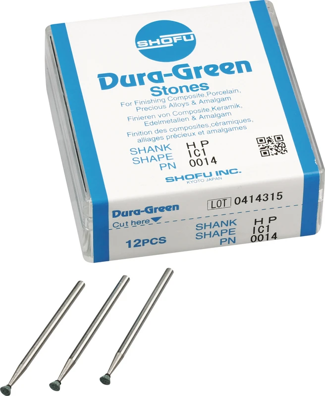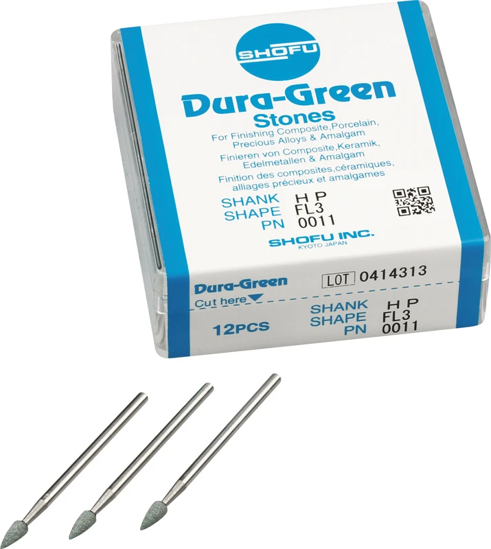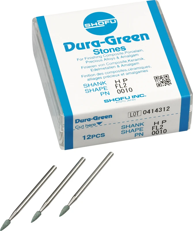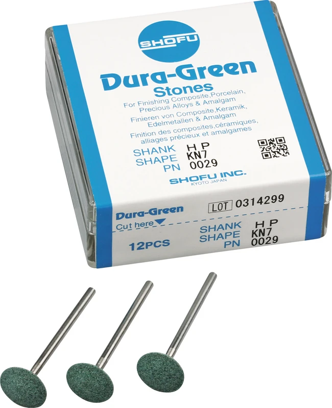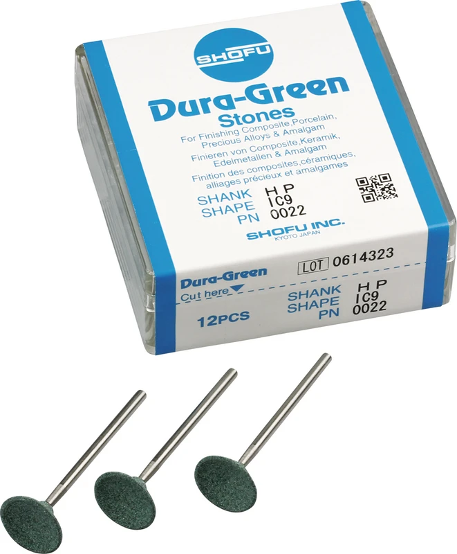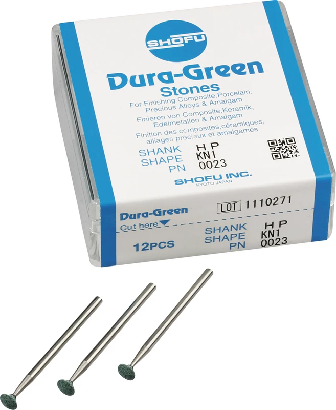 Dura-Green-Steine eignen sich hervorragend zum splitterfreien Ausarbeiten von Keramik, Komposit, Edelmetall und Amalgam. Empfohlene Drehzahl 5.000 – 20.000 U/min., max. Drehzahl 30.000 U/min. / AD 3 – 5 N.