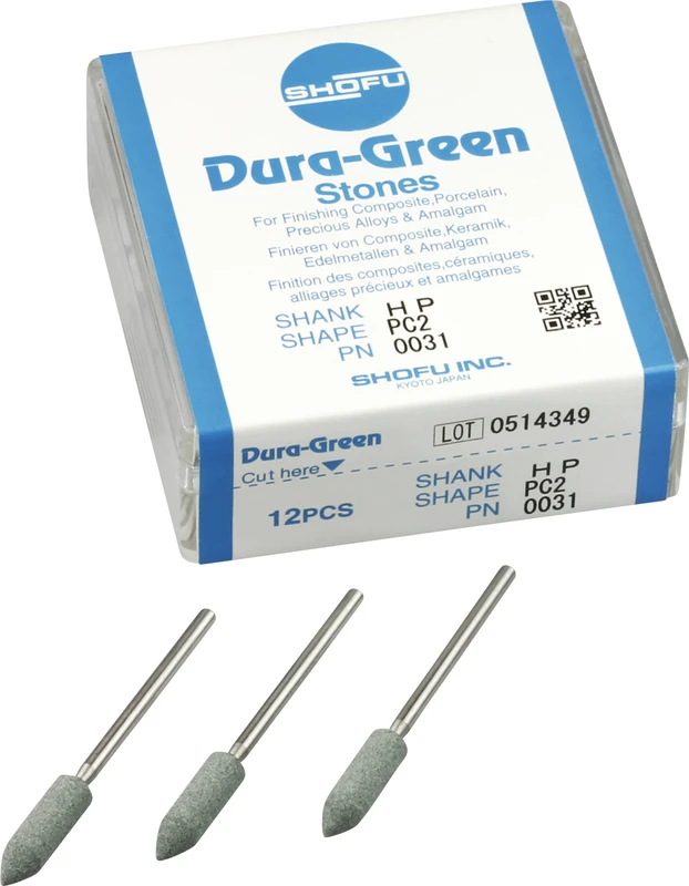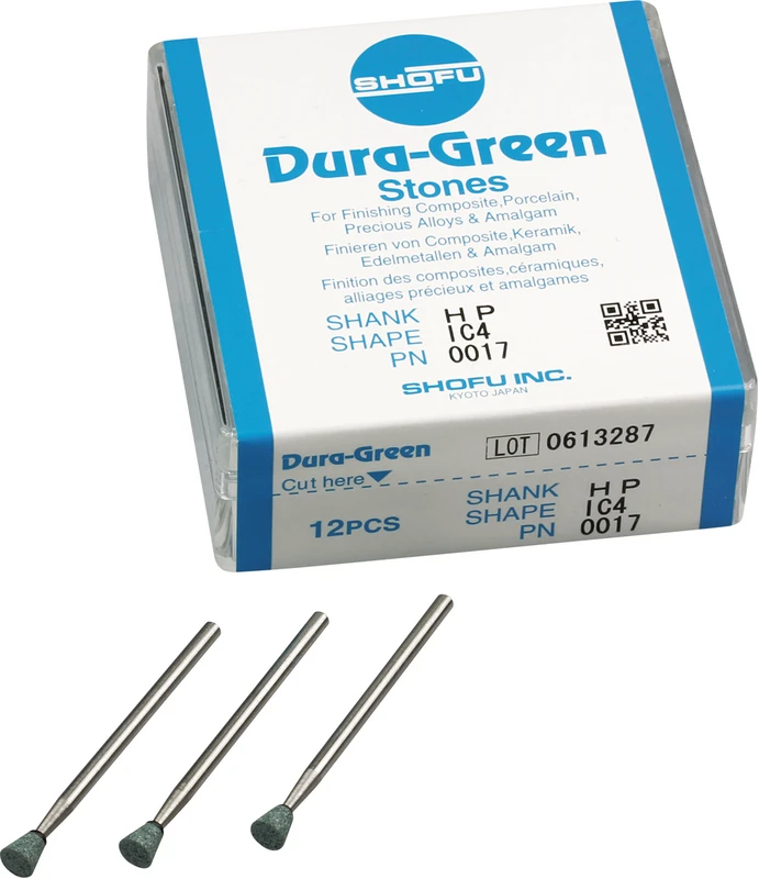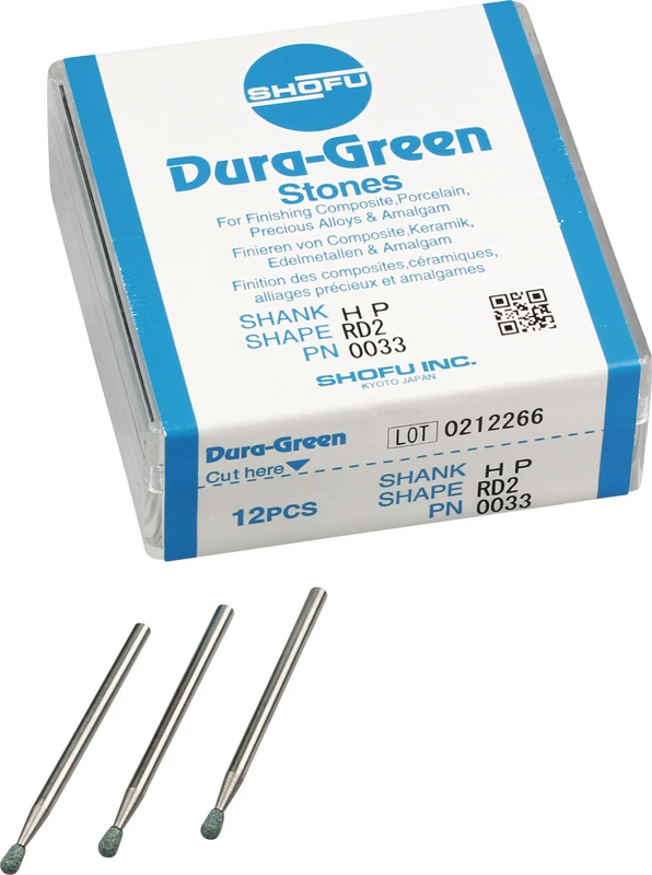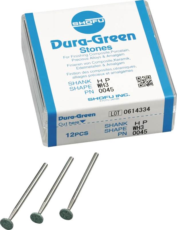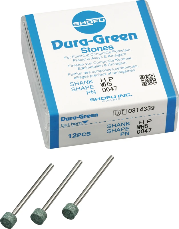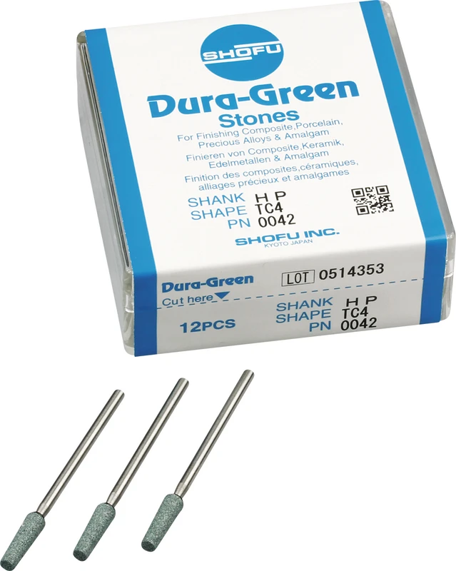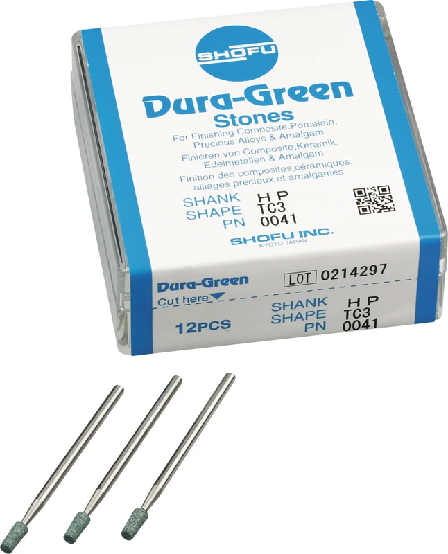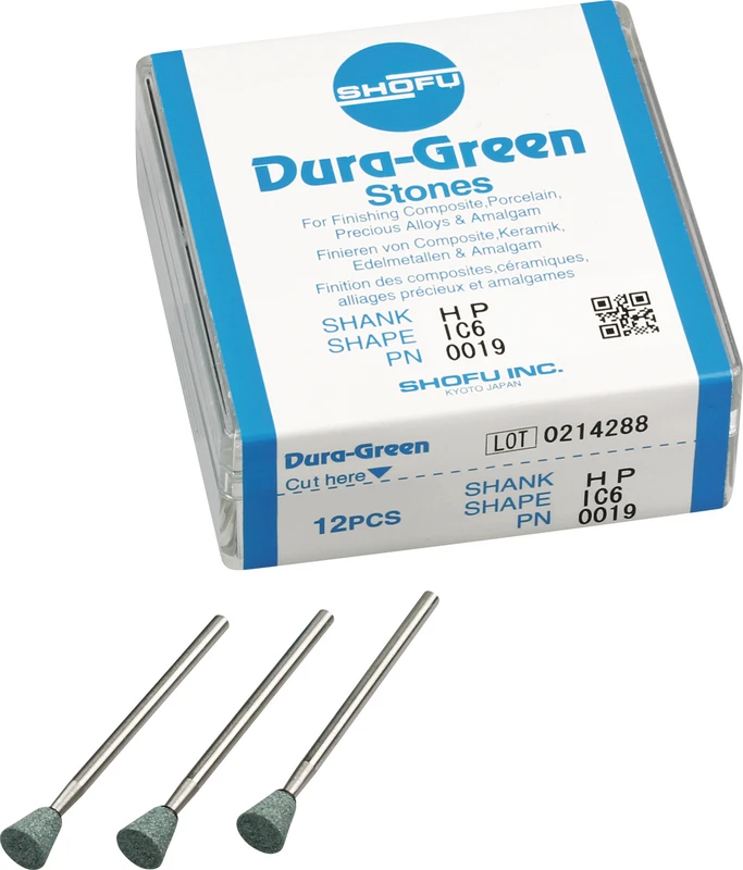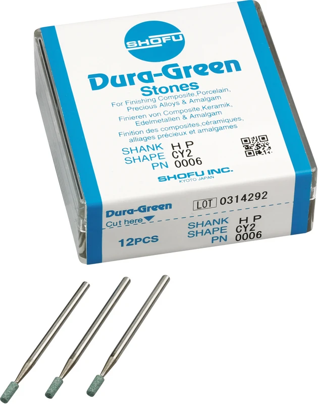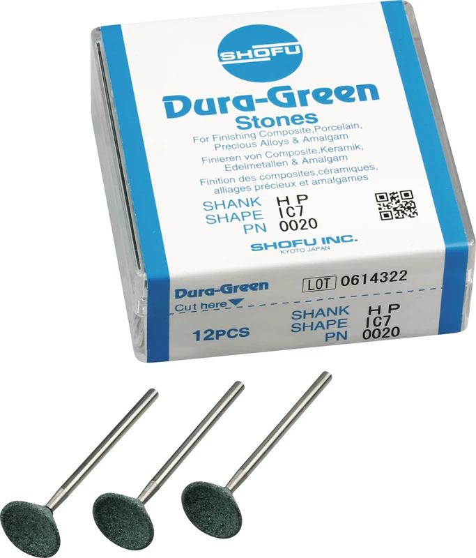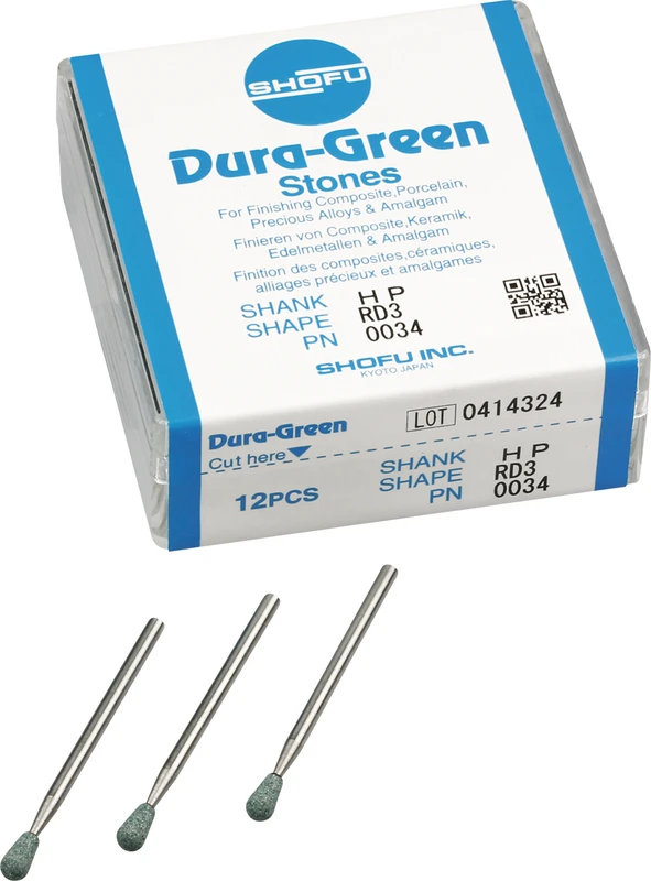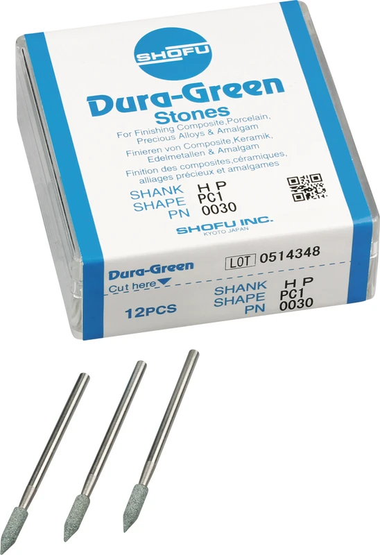 Dura-Green-Steine eignen sich hervorragend zum splitterfreien Ausarbeiten von Keramik, Komposit, Edelmetall und Amalgam. Empfohlene Drehzahl 5.000 – 20.000 U/min., max. Drehzahl 30.000 U/min. / AD 3 – 5 N.