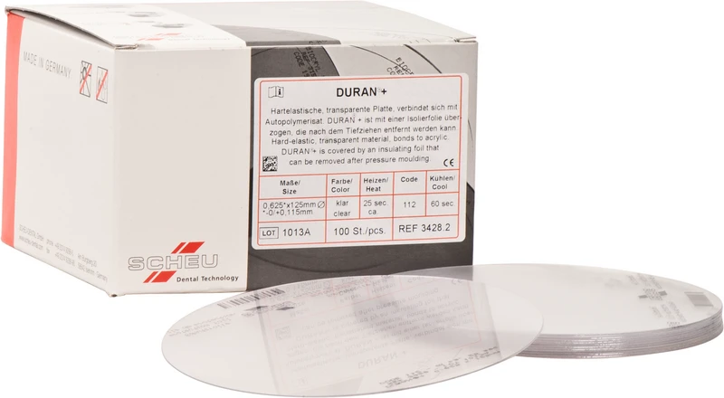 Med DURAN®+ utvides DURAN®-produktgruppen med en vakuumtrekkfolie med påført isolasjonsfolie. Vakuumtrekkeprosessen reduseres med ett trinn, siden man ikke trenger å trekke en separat isolasjonsfolie på forhånd. Det hardelastiske, transparente materialet binder godt til autopolymersystemer (f.eks. DURASPLINT) og egner seg for miniplast-, bitt-, interim- og fluorideringsskinner, røntgenmaler, snorkebehandlingsapparater, midlertidige kroner og broer.