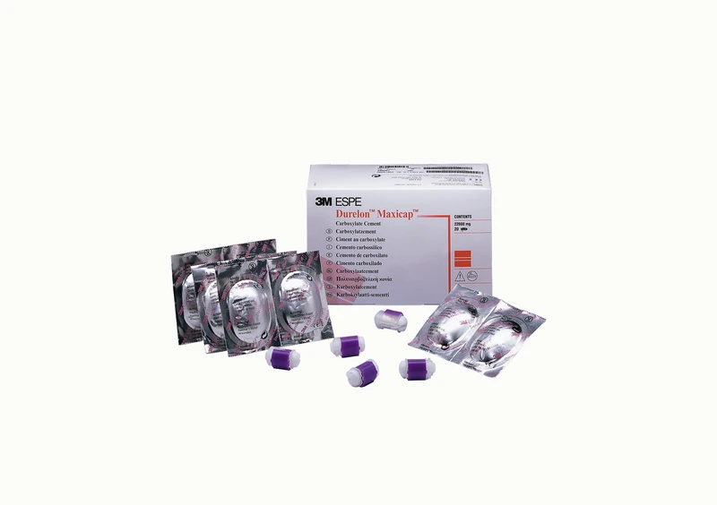 3M™ Durelon™ karboksylat-festemiddel sement som håndblandingsvariant i normal og hurtigbindende form eller for 3M™ Maxicap™ applikasjonssystem.