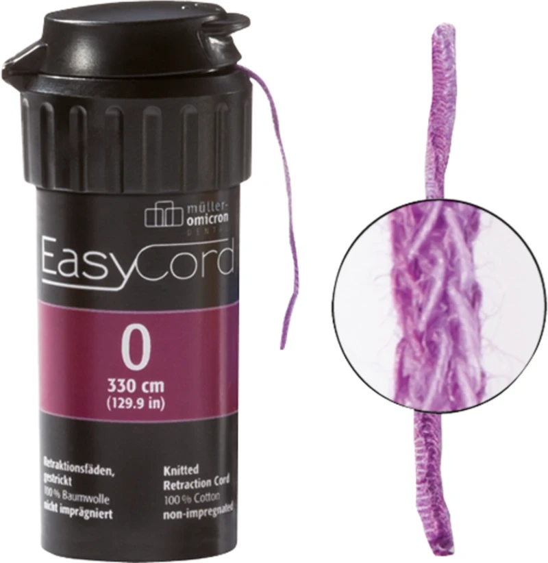 EasyCord retraksjonsfiler laget av 100 % bomull, strikket; ubehandlet, 330 cm. Det spesielle strikkemønsteret gir 30 % høyere opptakskapacitet gjennom høyhastighetsabsorpsjon. Den utmerkede kompresjonen gir væsken målrettet tilbake til påvirkning. Svært god elastisk oppførsel gir jevnt trykk og perfekt passform; EasyCord er lett å legge, fryser ikke og vikler seg ikke inn i roterende diamantbor.