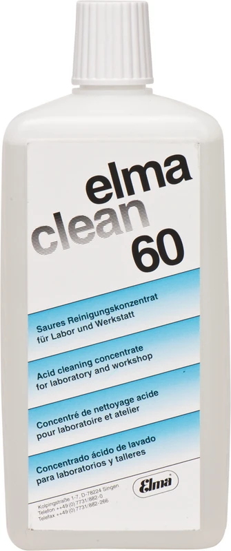 elma clean 60 Sur instrumentrenser/konsentrat. For sur grunnrengjøring av medisinske instrumenter i rustfritt stål. Videre egnet for glass og plast. Spesielt usynlige brune, oksiderte flekker fra instrumentene fjernes sikkert.