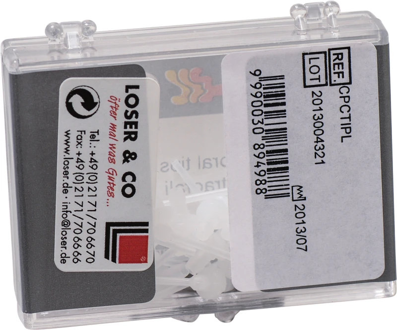 Intraorale tips for to-kammer blandesprøyte. Muliggjør punktnøyaktig påføring av fikseringssement.