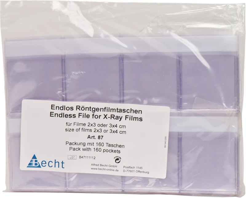 Endlos Röntgenfilmtaschen laget av spesialplastfolie med hvitt merkefelt, transparente poser.