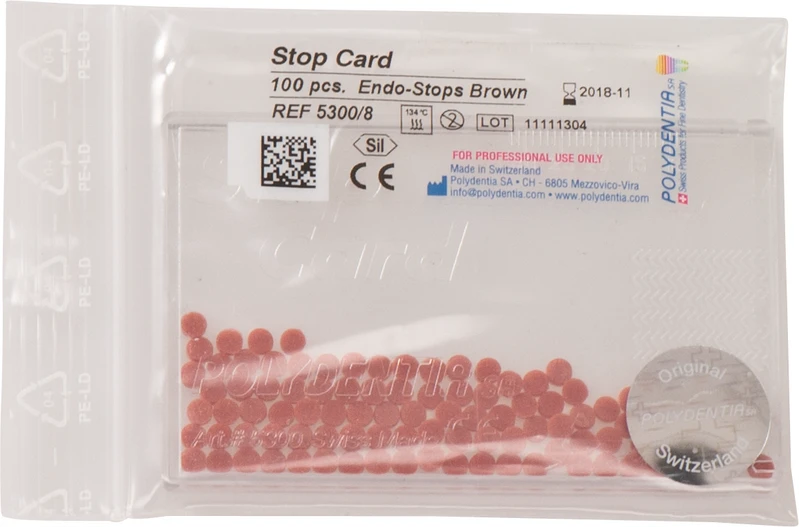 De Endo Stops har en Ø på 3,5 mm, en tykkelse på 1 mm og er lett synlige (røntgenopasitet). Autoklaverbar. En enkel, men praktisk dispenser for Endo-Stops, frigir kun én gummiring om gangen og holder den i posisjon.