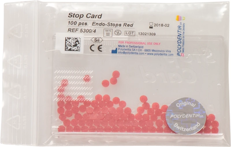 Endo Stops har en Ø på 3,5 mm, en tykkelse på 1 mm og er lett synlige (røntgenopasitet). Autoklaverbare. En enkel, men praktisk dispenser for Endo-Stops, gir bare én gummiring om gangen og holder den på plass.