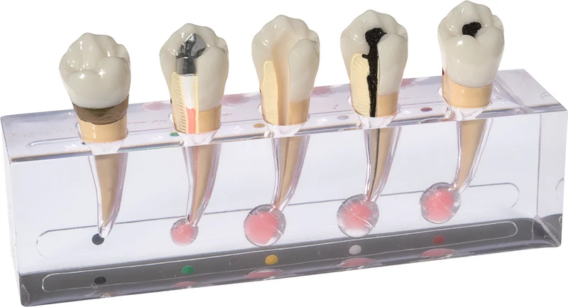 Modell med premolarer delvis åpnet helt til kanalen for å vise behandlingsstegene og den tilhørende tilbakegangen av et granulom.