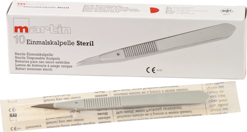 Sterilt pakket engangsskaler med plastgrep, rustbestandig.