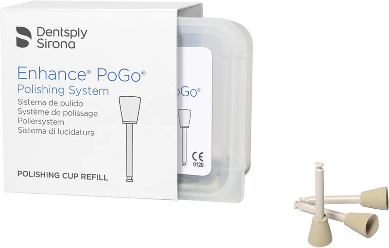 De Enhance® PoGo polisherne (skiver, kopper, spisser) er ferdigmonterte, til engangsbruk, diamantstøv-impregnerte og urethan-dimetakrylat-behandlede poleringshoder for finpolering av alle komposittoverflater.