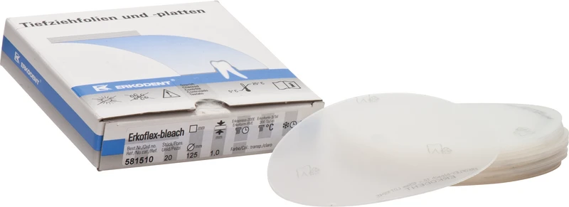 Erkoflex-bleach er et fleksibelt materiale med høy elastisitet og formstabilitet. Binder seg ikke til autopolymerisat. Til fremstilling av blekingsskinner, fluorideringsskinner, medikamentbærere. Hardhet ca. 95 Shore A. Med underlagsfolie for modellisolering og krympkompensasjon.